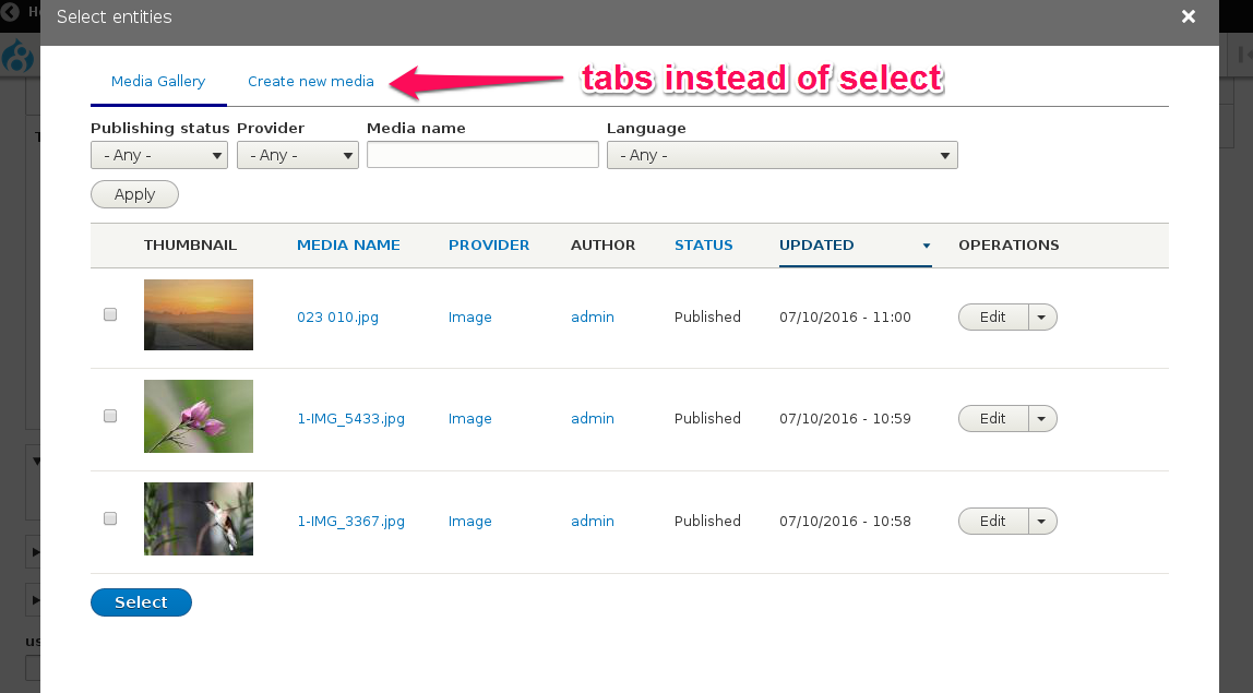 For example, a site builder could create an Entity Browser containing 2 widgets: "Media Gallery" (a view) and "Create new media" (an entity form), and the mechanism to change between these two widgets is defined in the widget selector plugin configuration.