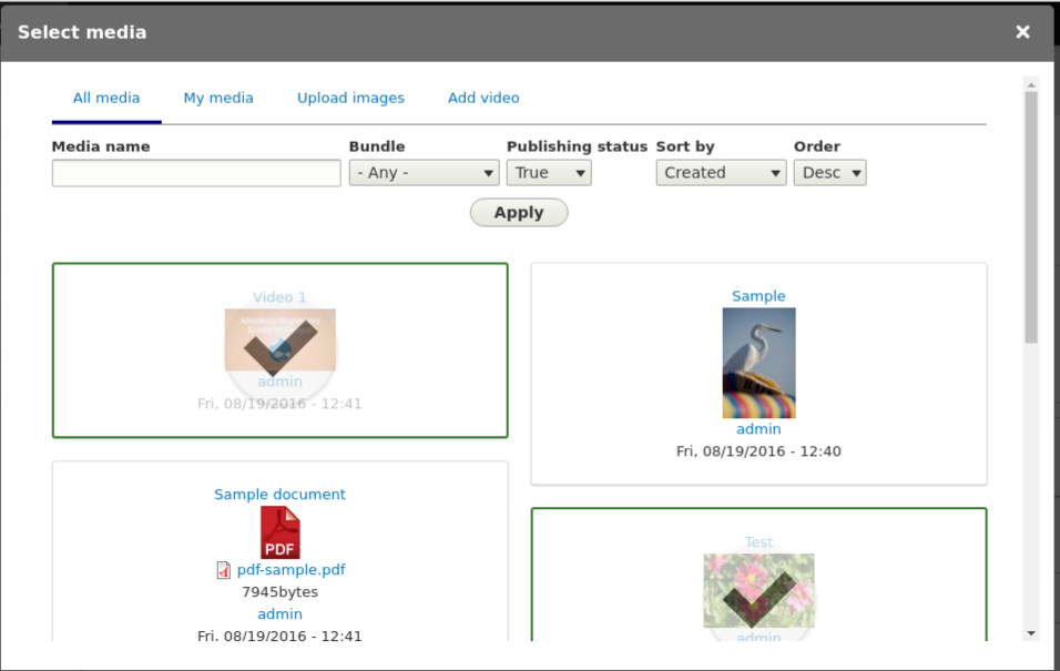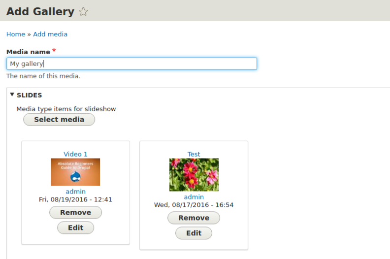 Creating galleries is really simple with the media module. Go to media\/add\/gallery and enter the title of the gallery. Then select the media items to be included in the gallery by click on "Select media" in the slides section. Choose the items from the media library or upload new items by clicking on the "Upload images" or "Add video" tab.