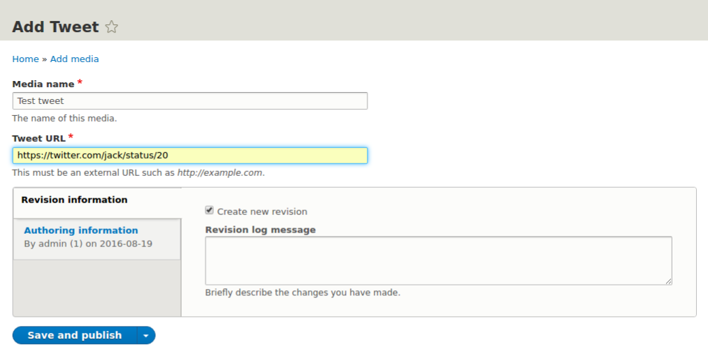 Adding tweets are a simple process using the media module. Open media\/add\/tweet and enter a valid title and tweet URL. Refer the below image to see the sample URL.