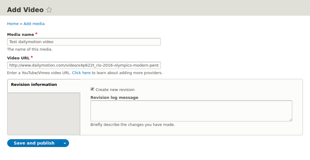 For example, to add Dailymotion videos to your website, just enable the video_embed_dailymotion module(The name of the module can be found on the video_embed_field module page). Once the module is enabled, simply visit media\/add\/video and start adding dailymotion videos.