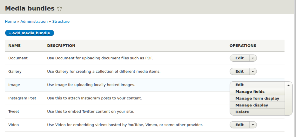 - Visit admin\/structure\/media and in the Image dropdown, click on 'Manage fields'.